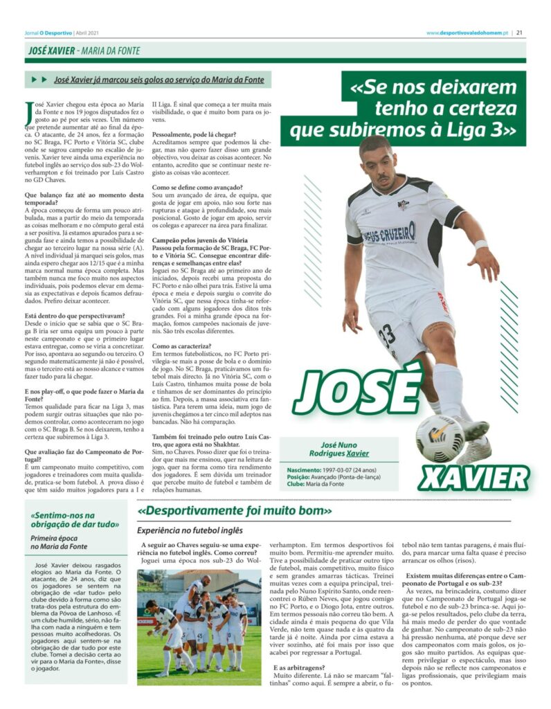José Xavier chegou esta época ao Maria da Fonte e nos 19 jogos disputados fez o gosto ao pé por seis vezes. Um número que pretende aumentar até ao final da época. O atacante, de 24 anos, fez a formação no SC Braga, FC Porto e Vitória SC, clube onde se sagrou campeão no escalão de juvenis. Xavier teve ainda uma experiência no futebol inglês ao serviço dos sub-23 do Wolverhampton e foi treinado por Luís Castro no GD Chaves.